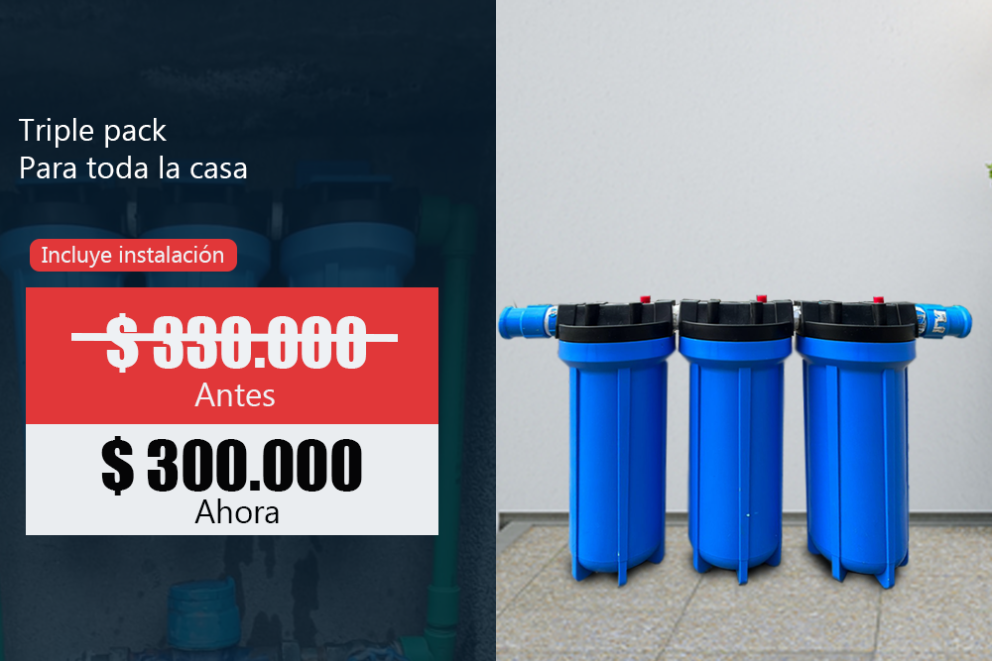 Consiste en tres filtros instalados en línea con carcasas oscuras para evitar la formación de microorganismos en su interior, este producto mejorara la calidad del agua y evitará la formación de sarro dentro de las cañerías y evita su adhesión a los artefactos del hogar.